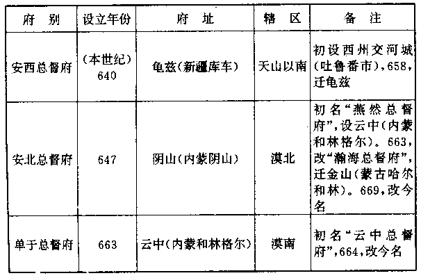 佛教译经事业在本世纪(七)达到高峰,玄类之后,便无以为继。因为佛教在发源地的印度已告没落,不再有新的经典出现。佛家学派在大量问世的佛经冲击下,更分为很多琐碎的派别,如“律宗”、“禅宗”、“华严宗”、“法相宗”等等,在自己的小天地中,互相排斥攻击。但真正的佛教,却终于抛弃掉大乘的纠缠,成为纯净的宗教,跟道教一样,向民间传播,这种力量超过仅在士大夫之间流行的大乘万倍。因果报应,轮回转生,冥冥中自有神灵为人类主宰的观念和信仰,深植人心。 第二个黄金时代带给中国对外的最大成功,是恢复固有的疆土。大分裂时代使沿边土地大量丧失,隋王朝虽一度振发,但时间太短,不久即因政府覆亡而再丧失。唐王朝最初的目标只希望排除北方突厥汗国的威胁。可是接连着不断的军事胜利,使中国疆域回到纪元前三世纪秦王朝和纪元前一世纪西汉王朝时的版图,而且还要超过。唐政府在沿边疆土,先后设立下表所列的六个总督府(都护府),像六根巨柱,保卫中国本土。