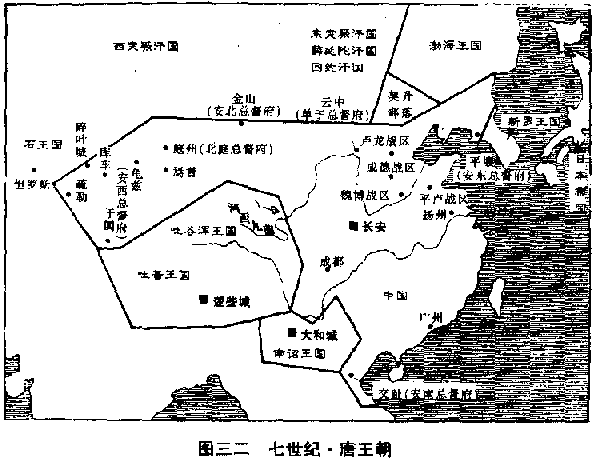 东突厥汗国各部落从此星散,但仍不时有“可汗”出现,或出于某一些残余部落的拥立,或出于中国政府委派照顾某一些残余部落。其中也不断有若干可汗跟中国对抗,不过都像火花一样,倏燃倏熄。如此断续地维持到下世纪(八)七四五年,最后一任大可汗白眉可汗被回纥汗国的怀仁可汗击斩,才彻底消灭。 东突厥汗国所属的铁勒部落,组成份子跟突厥一样,也十分复杂,包括很多不同种族的小部落,其中有两个小部落最为强悍,一是薛延陀部落,一是回纥部落。六二八年,薛延陀部落酋长夷男取得铁勒部落领导权,遂脱离东突厥,自称可汗,建薛延陀汗国。两年后六三○年,东突厥汗国星散,薛延陀汗国就收纳突厥的流亡部落,进入突厥故地,直接跟中国为邻。中国的富饶诱使它跟突厥一样,不断南侵。不过它的运气太坏,恰巧遇上中国第二个黄金时代。六四六年,中国大将李道宗亲王出击,薛延陀兵团崩溃,最后一任可汗咄摩支可汗向中国投降,汗国灭亡,立国只短短十九年。 薛延陀汗国灭亡后,回纥部落立即填补起来沙漠上的权力真空。但它仍然是一个部落形态,中国册封它的酋长为瀚海都督。 西域(新疆及中亚东部),中国的故地,但丧失的时间已有六百年,是太久了,所以当本世纪(七)四十年代,中国势力向西扩张时,面对着的是一个完全新面貌的西域,已非纪元前二世纪张赛和纪元后一世纪班超时代城邦林立的西域。现在西域只剩下几个大国:高昌王国、焉耆王国、龟兹王国、于阗王国、疏勒王国、西突厥汗国,在互相争夺霸权。其中焉耆、龟兹、于阗、疏勒都是古老的王国,因并吞邻国之故,疆士大大地膨胀。 引起中国势力西进的是建国于车师前王国故地的高昌王国,面积达五万左右平方公里,首都交河城(新疆吐鲁番)。它跟西突厥汗国结盟,对中国采围堵政策,封锁边境,断绝中国跟西域的交通。虽经中国一再呼吁,但仍扣留中国难民不准回国。六四○年,中国大将侯君集西征,高昌兵团大败,西突厥汗国协防的驻屯军惊骇之余,垦夜撤退。横挑强敌的国王囗文泰忧愤而死,继位国王囗智盛出降,被送到长安,国亡。中国把交河城改为西州,可汗浮围城(新疆吉木萨尔)改为庭州。 接着是焉耆王国,东西横亘四百公里,首都焉者城(新疆焉耆),跟中国邦交一向敦睦。侯君集灭高昌王国时,焉耆国王龙突骑支因跟高昌是世仇之故,还亲自到中国远征军司令部道贺。可是后来却和西突厥汗国缔结婚姻(西突厥大臣的弟弟,娶了龙突骑支的女儿),对遥远的中国转为冷淡,并一再扣留过境的中国使节和往返中国的其他国家的使节。六四四年,驻军高昌的安西总督(安西都护)郭孝恪进攻焉耆,生擒龙突骑支,另立一位新王。但中国远征军撤退后,西突厥汗国来攻,把新王杀掉,另立王族亲戚龙薛婆阿那支当国王。四年后(六四八),中国大将阿史那(姓)社尔(名)西征龟兹王国时,顺便攻击焉耆,把龙薛婆阿那支杀掉。这一次中国兵团不再撤退。 龟兹王国,面积约十万平方公里,拥有七百余个城镇,首都伊逻卢城(新疆库车)。最初跟中国相处也很好。但西突厥汗国终于把它争取过去,参加对中国的围堵。六四八年,中国大将突厥籍的阿史那社尔西征,生擒国王白河黎布失毕。中国原设在西州(新疆吐鲁番)的安西总督府,遂向西推进,移到龟兹。 疏勒王国(新疆喀什)、于阗王国(新疆和田),两个与龟兹王国面积相当的国家,没有经过战争,就向中国投降。中国遂在焉耆、龟兹、疏勒、于阗,设立四个军事据点,称为“四镇”,隶属安西总督,作为中国西陲屏藩。六七○年,吐蕾王国以倾国兵力对西域攻击,四镇一时陷落。二十二年后的六九二年,中国大将王孝杰反攻,吐蕃败走,四镇又回到中国版图。 对西域(新疆及中亚东部)诸国来说,中国和西突厥汗国,是两个巨人。西域诸国处在中国和西突厥汗国夹缝中,跟前二世纪时处在中国和匈奴汗国夹缝中一样,十分狼狈。上述五个王国,就是两大超级强权间的牺牲品。等到所有独立王国都被中国并吞,中国边境向北向西推进,直接跟西突厥汗国接触时,终于爆发一场决战。六五七年,中国大将苏定方率领远征军,包括回纥兵团和若干归附中国的东突厥兵团,向西突厥汗国总攻,三道并进。西突厥沙钵略可汗亲统十姓(十个部落、兵团,自中亚向东挺进迎击。两国大军在伊丽水(新疆伊犁河)以北相遇,沙钵略可汗大败,率领残军渡伊丽水,向碎叶水(哈萨克吹河,或译楚河)撤退,中国远征军穷追,在碎叶水北岸再次决战,沙钵略可汗再大败。带着左右少数侍卫,向西逃亡。逃到咸海东南的石国(乌孜别克塔什干市),被石国生擒,交给抵达城下的中国远征军。 跟东突厥汗国的情形一样,西突厥汗国的部落从此星散。以后虽然同样也有“可汗”兴起,总归昙花一现。到下世纪(八)四十年代七四二年,最后一任中国派遣担任大可汗的阿史那听,被突骑施部落击斩,西突厥汗国途名实同亡。 中国在西域获得的是完整的胜利,跟张骞、班超时代有很大不同,那时不过限于移植屯垦,主要的是断匈奴右臂的军事联盟。而本世纪(七)起,却设州设县,又设军区,把西域纳入中国行政系统,正式成为中国领土。 但在西方边陲,中国的扩张却受到挫败。 西方边陲的吐谷浑汗国(青海省),是四世纪五胡十九国之一前燕帝国的兄弟国。弟弟的一支进入中国本土,在邺城(河北临漳)建立前燕帝国。哥哥的一支辗转二千公里之外,来到青海湖
