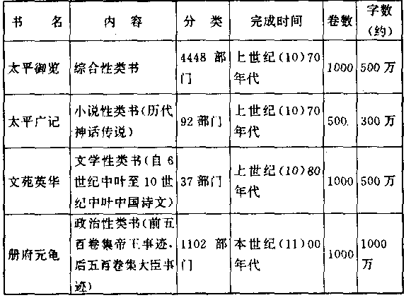 它们因是私立的,所以毕业生不能像国立大学的毕业生一样,有法定的地位。但它们却全由政府官员创设,几乎全靠政府的支持。石鼓学校成立最早,应该是中国最早的私立大学。其他四个学院也都成立于上世纪(十),只是到了本世纪(十一)才开始显示出它们的影响。而白鹿洞书院,到了下世纪(十二)时,学生将近一万人,竟成为儒家学派主流——道学(理学)的大本营。 和学校教育配合的是图书,中国历代政府都设有藏书机构。宋政府的藏书机构是崇文院,即国立图书馆。国立图书馆包括四个单位,称为“四馆”,即“昭文馆”、“集贤殿”、“史馆”、“崇文院秘阁”。昭文馆负责搜集和保管图书,集贤馆负责对藏书校正错误,史馆负责搜集史料和编写史书,崇文院秘阁负责保藏特别珍贵的书籍和名画。图书最多时达七万三千卷,约七亿三千万字,比唐王朝略少。它的流通量当然很小,不过非法外流的数目很多,如管理人员私相授受,甚至偷窃而去,但对知识传播,却有贡献。 国立图书馆在宋政府另有一种特殊地位,它是政府高级官员(包括宰相)的候补人才储备所。“四馆”里的供职官员,在术语上称为“馆职”,全由具有儒书丰富知识的人选担任。一旦担任馆职,就等于确定了他光明的前途,因之成为新进知识分子最重要的追求目标。 然而,国立图书馆最大的贡献,是它编纂了下列四部巨大的“类书”。类书,是中国特有的一种丛书,即把千百种图书所包括的相类似的事件,编纂在一起。读者如果需要某一类的资料,可免去翻查千百种图书的艰苦。