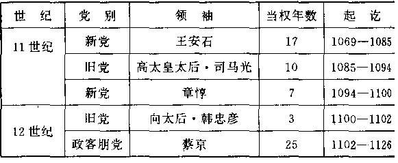 党的名称,以领袖的籍贯而定。程颐,洛阳(河南洛阳)人。苏武,眉山(四川眉山)人,属于古蜀地。刘挚,东光(河北东光)人,属于河朔地区。他们之间的斗争全是意气斗争,但十分激烈,而且很自然地把自己纳入君子系统,而把对方驱入小人系统,互相恨入骨髓。宋政府在对新党人士大批放逐外,又忙着大批放逐内斗中失败了的旧党。 一○九三年,旧党护法神高大皇太后逝世,已经十八岁的皇帝赵煦对这位干涉国政的老祖母,早忍受够了。他跟老祖母当年迫不及待召回旧党领袖司马光一样,也迫不及待地召回新党领袖章惇,恢复新法,贬窜旧党——只一位例外,就是司马光最得力的党羽之一蔡京。当司马光下令以五天的时间为限,撤销“免役法”,恢复“差役法”时,大家都担心时间短促,不容易办到。原属新党的蔡京正担任首都开封市长(知开封府),竟如期完成,以致司马光呼吁旧党人士向蔡京看齐。现在他看见旧党失势,叛离旧党,再投入新党。 我们可把两党交互当权情形,作一排列: