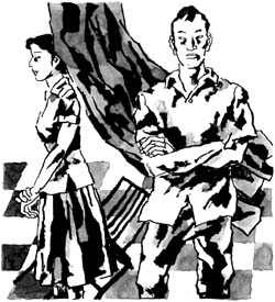 经过一番激战,夫妻双双“挂彩”,两败俱伤。还是晶晶喊了一句:“我不跟你这混账过了,离婚!”才停止了战争。陶路余怒未消,还击道:“离就离!谁稀罕你这个母夜叉!”