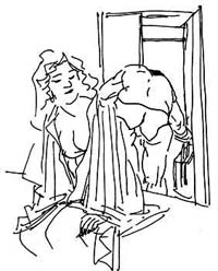 吴贵欲火焚身,醉眼放淫光。他飞快地脱下衣服,可四下一瞧,没地方放呀,小环赶紧说:“先生你把东西放在大衣柜里吧。”