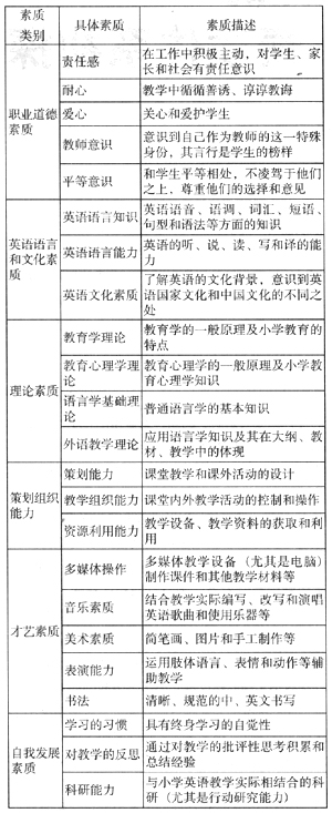 研究者们提出了大量关于小学英语教师应具备的各种类型的素质。例如:王蔷指出,小学英语教师应该具有合格的英语语言能力(如:良好的语音语调、书面表达、口头交际能力和语法理解能力等)、适合于儿童的教学方法、其他各方面才艺(如:唱歌、跳舞等)以及游戏和活动的组织能力;张亚军认为小学英语教师应具备的素质能力应包括:优良的思想品质、较高水准的英语语言能力、英语教学理论素养、创新意识和终身学习的自觉性。笔者认为,在讨论这一问题时,应主要考虑以下两个方面的因素:首先,应该考虑英语课程标准的要求。课程标准规定了课程性质、要达到的目标和教学实施的建议等。小学英语教师的素质应与英语课程标准的要求相适应。第二,应该考虑小学生的心理特征。小学英语教师的素质应该与小学生思维方式、兴趣和心理需求等相一致。Enos介绍了学生眼中构建的理想英语教师应具备的素质。他指出,学生提出的建议往往同大多数教育学和教育心理学理论对教师的要求相吻合。