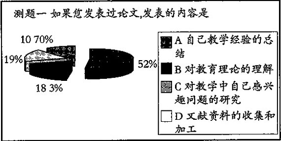 选择A占52%,B占18.3%,C占19%,D占10.7%。被调查教师撰写论文更多选择了对自己教学经验的总结,而较少选择对教学中自己感兴趣问题的研究(见图一)。
