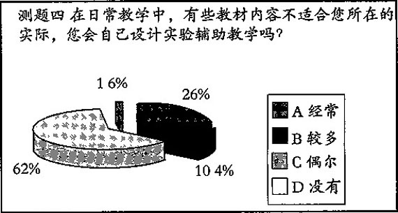 选择A占25.6%,B占10.4%,C占62.4%,D占1.6%。可见科学教师自主设计能力较弱。 (见图四)。