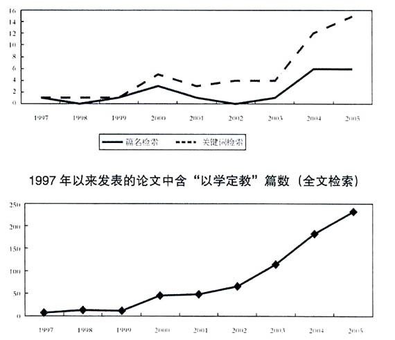 从文献数据统计可见,文中提及“以学定教”的文章数量不少,但以“以学定教”作为标题或关键词的文章却不多。绝大多数文章是学科教学中的方法层面上的“以学定教”,理论研究几乎仅限于笔者1997年的那篇文章。