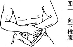 1.向下推腹(图一):全身放松,两手掌重叠,从剑突向下推腹直至耻骨联合,反复36次。
