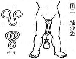 10.挂沙袋:将边长为0.5米的正方形纱布折叠成纱布袋后,两头缝合,并另做一活扣备用。站立式,两足距离应比肩宽,将活扣套在阴囊及阴茎根部(扣扎松紧适度,阴毛在外),下挂3—4千克重的沙袋(沙袋离地),练功者两手叉腰,臀部前后摆动,带动沙袋摆动60—100次。以阴茎、睾丸充血、微微酸胀而不痛为佳(图二)。