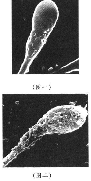 正常的健康精子是一个光头、漂亮、圆滑、具有流线体体形的小精灵,在射出的精液中,它能充分自由、前赴后继地奔向卵子,争取达到目的——授精。看看这是一张(图一)健康精子的电子显微镜的照片,每个精子——人之初,都应该如此漂亮、美观,都应该是具有快速活动能力的小精灵。遗憾的是一旦被解脲脲原体感染以后,它就不一样了,完全失去了往日的光彩。