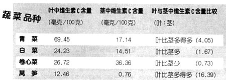 近几年来,市场上的蔬菜品种琳琅满目,数不胜数,既不受季节之局限,也无地域之阻隔,全国各地的各种蔬菜在集市、超市卖场均可觅见。但我们发现在日常生活中,有些人对不同蔬菜茎叶中的维生素c含量并不了解,因此有些食用“误区”,诸如吃营养价值低的部分、弃营养价值高的部分之类的事情时有发生,造成了很大的浪费。为了避免这种情况的发生,本文谨将最近的研究发现公之于众,以飨读者。