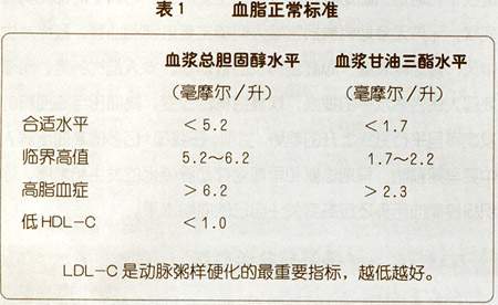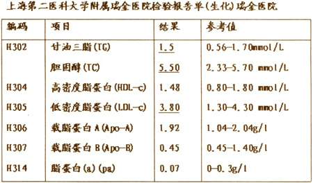 表面上,从化验单上的参考值看此病人的血脂属“正常”,但用表1、表2标准衡量就可发现:①总胆固醇5.5毫摩尔/升,已属临界高值。②LDL-C: 3.8未达标。③若此病人有糖尿病或肥胖胰岛素抵抗状态则甘油三酯应降得越低越好,我们观察到对甘油三酯最好<1.2毫摩尔/升。