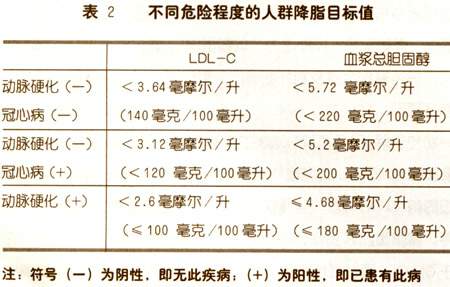 每个病人的血脂应该降到什么理想水平?根据“量体裁衣”的原则,不同危险程度,降脂的目标值也各有要求(见表2)。