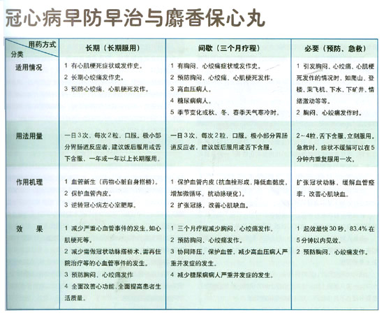根据多年麝香保心丸临床应用及实验结果,其防治冠心病的方法可以归纳如下表,以便参考。