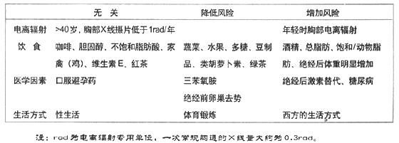 第四,饮食、辐射、医疗、生活等方面和乳腺癌的关系。乳腺癌是和生活方式有很明显关系的恶性肿瘤。我们生活方式的改变可能对乳腺癌的发病有一定的影响。我记得在美国学习时,对美国医生说起美国乳腺癌很多,他们说这和西方生活方式有关,我又说你们美国胃癌病人很少,他们说这也和生活方式有关,胃癌主要和生活条件比较差、饮食结构比较粗糙、不新鲜食物有关系。所以随着我们生活条件的改变,有些肿瘤的发病率增高了,比如女性的乳腺癌和卵巢癌,男性的前列腺癌,还有大肠癌、胆囊癌等等;而有些肿瘤的发病率降低了,比如女性的子宫颈癌,还有胃癌、肝癌、食道癌,它们的发病率都在逐步地下降,这也与我们的生活条件的改善有关。下表是各种外部因素与乳腺癌的关系: