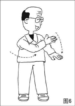 ①腰渐渐左转至45℃,左右掌随之边内外旋边左运。旋至右掌心斜向上,高与胸齐,左掌心向下,高与胯齐。然后腰右转,带动两掌右运。转至正南时,右掌心向里,高与嘴平,掌心距脸30厘米左右;左掌心斜向上,高与小腹平(图6)。