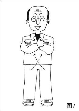 ①两掌重迭于肚脐前(左掌在外,掌心向内),两腿渐起,两掌随之边继续交叉,边外旋、边向外、向上升,至胸平成手腕交叉,掌心向里(图7)。两肘外撑外分,至手指分离时,两掌渐变拳,拳眼向上。两臂继续外分至120℃时,两腿自然直立。两臂成弧形(图8)。