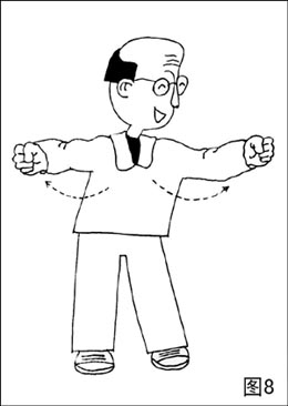 ②胯向右,重心移至右腿,上体向左侧晃,头微左转,眼睛平视。然后上体转正直,两拳左右放平;胯向左与胯向右同,惟左右方向相反(图8)。