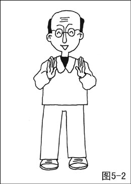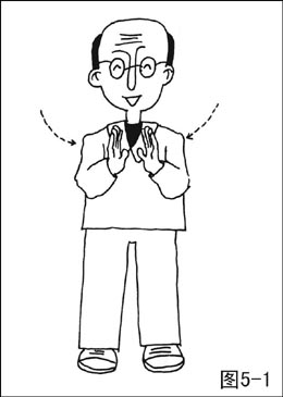 ②两掌边外旋(至掌心相对,手指向上)边屈肘至拇指距胸约两平拳,边向里合,合至颈宽;然后两掌向外分开至肩宽,同时两腿随两掌的开合而起蹲(图5-1,图5-2)。