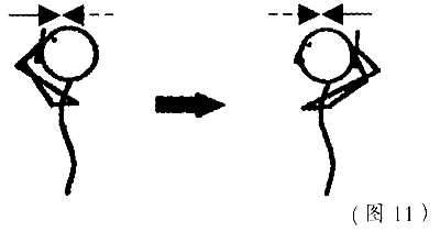 3. 胸开合运动两手叠加在脑后,头慢慢地向前倾倒,双肘合拢,下颌向胸部尽可能接近。然后头后仰,胸反向开张(图9)。