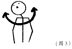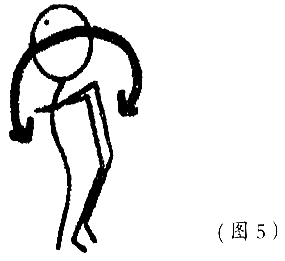 2. 肩回旋运动肩部前后作大回环运动。以肩关节为轴心,手臂先向前,再向后作绕圈回环运动(图5)。