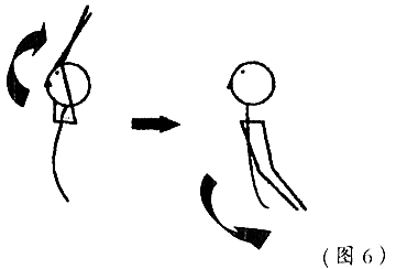 3. 臂膀的前后运动一边伸展背肌,臂膀上举到耳后,然后向前平直放下,绕向后方,尽可能后伸(图6)。