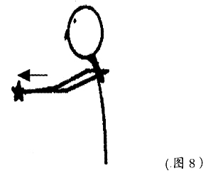 2. 腕伸展运动两手臂交叠,最大限度地前伸。此时,下颌内收,大口地吐气。然后两手交叠向里回收。同样的动作反复进行(图8)。