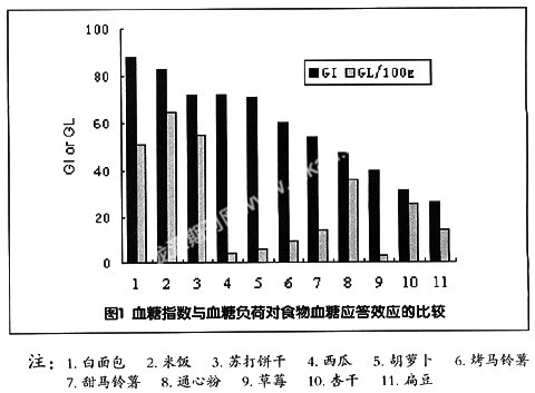 为了说明血糖指数与血糖负荷的差异,现选取几种代表性的食物比较其血糖应答的效应。结果见附图。比如胡萝卜与西瓜的血糖指数分别为71与72,单从血糖指数值考虑,属于高血糖指数食物,许多人错误地认为糖尿病患者不能食用这类食物。但是西瓜的水分多,胡萝卜含纤维高,其单位重量食物中血糖负荷并不高,每100克食物血糖负荷分别为5.5与3.9,日常食用量不会引起血糖的大幅度变化。要产生实验条件下(含50克碳水化物)的血糖应答,则分别需摄入909克西瓜和649克胡萝卜,远远超过正常情况下实际摄入量。如梳打饼干和西瓜的血糖指数都是72,但是前者的血糖负荷为54.86,后者5.47,前后相差10倍。因此,脱离单位重量食物碳水化物含量、食物总体积及含水量等因素,单纯根据食物GI高低选择食物是不科学的。