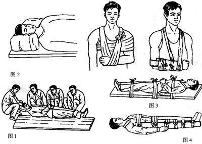 四肢骨关节损伤可用夹板和木棍、竹竿等将断骨上、下方两个关节固定(图2,4),若无固定物,则可将受伤的上肢绑在胸部,将受伤的下肢同健肢一并绑起来。躯干骨的固定一般在搬运上担架后。颈椎骨折需平卧于担架上,头及颈两侧用衣物固定;胸腰椎骨折亦需平卧,身体两侧衣物固定或布带捆扎(图3);骨盆骨折除平卧外,可用布带对骨盆处进行捆绑包扎。四肢软组织通常使用胶布条固定。