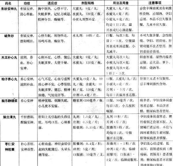 安神药的作用机理是通过调整脏腑功能,平调脏腑间的关系而达到安神的目的,它分为重镇安神和滋养安神两类。朱砂安神丸偏于泻火清心,适用于由火旺伤阴,心失所养致心悸失眠;磁朱砂丸同f属重镇安神药,但磁朱砂丸偏于交通心肾,摄纳浮阳,适用于水不济火的失眠,耳鸣耳聋,视物昏花等证;养血安神丸偏于由阴虚火旺引起的心悸;天王补心丸与柏子养心丸偏于由气血两虚引起的不寐,但是柏子养心丸药性比天王补心丸偏温,故适用于老年人和妇人产后血虚者;脑乐静糖浆偏于由心虚肝郁引起的忧郁伤神,表现为精神恍惚,时常悲伤欲哭等;脑立清丸是对风阳上扰引起的眩晕的首选;安神补脑液偏于由脾肾两虚引起的不寐,枣仁安神胶囊偏于由心肝血虚引起的不寐。
