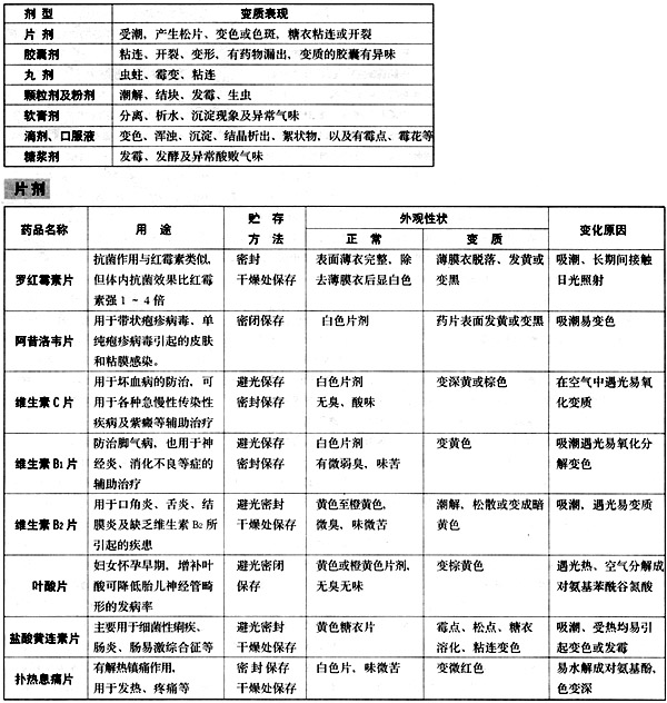 目前家庭常备药品按剂型可分为片剂、合剂、糖浆剂、胶囊剂、丸剂、冲剂、软膏剂、滴剂、胶囊剂等等,我们首先来看看不同剂型的药品在变质时会有些什么变化(见左表)。
