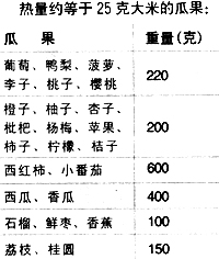 糖尿病患者每天可以吃一份水果(见下表),表中一定重量的瓜果所含的热量约等于25克大米产生的热量(即90千卡)。