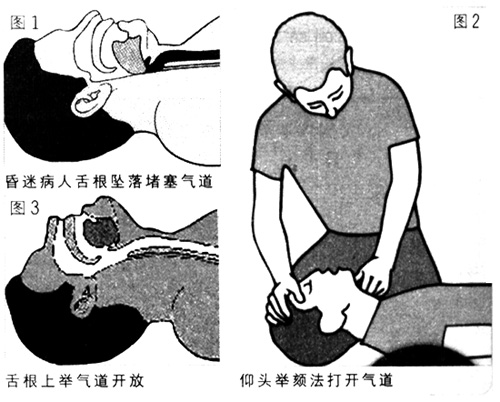 如果病人的病情没有危及生命,则家人应留在病人的身边,尽量给予其精神上的安慰,并进行必要的生活上的照顾,耐心等待救护车的到来。如果病人病情危重,甚至已处于昏迷,由于舌根下坠堵塞气道入口处(图1),则应首先考虑用仰头举颏法(图2),使病人保持气道通畅(图3);出血不止者,应及时止血、包扎;对于骨折者应不能搬动肢体或临时用木板、扫帚柄等给予肢体固定。如果发现病人心跳、呼吸停止,则应立即进行现场心肺复苏初级救生。