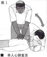以上就是平时所称的心肺复苏术。如果单人操作,则以15:2进行,即15次胸外心脏按压和2次人工呼吸交替进行(图1);