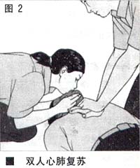 如果是双人操作,则以5:1比例,即5次胸外心脏按压和1次人工呼吸交替进行(图2)。