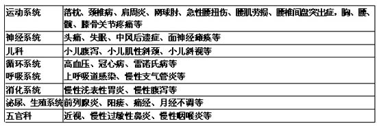 以上这些病例,仅是推拿所治疗疾病的一部分。不要忽视推拿的作用,它能治疗的疾病种类很多,见下表: