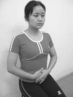 将左手掌心叠放在右手背上,将右手掌根置放在上腹部,适当用力做顺时针环形摩动0.5~1分钟。以上腹部有温热感为佳。