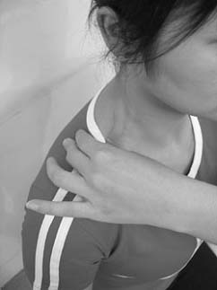 将一手拇指与食指、中指对合用力拿捏对侧肩井穴0.5~1分钟。双肩交替进行。