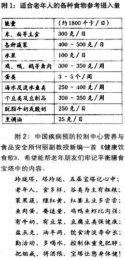 参照国外的做法,我国营养学专家制定了有中国特色的平衡膳食宝塔(左下图)。这是膳食指南的量化和形象化的表达,也是人们在日常生活中应用膳食指南的便捷工具。由于老年人身体条件的特殊,以及与年轻人不同的营养需要,美国农业部老年营养研究中心对膳食指南作了补充,使其更加符合老年人的实际(见下图)。