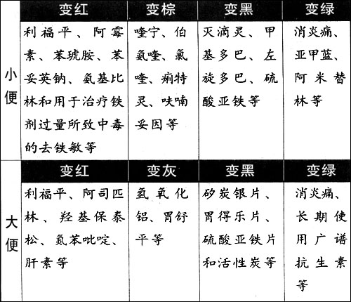 提醒:有时某些药物确有可能引起对人体的危害而致排泄物变色。例如阿司匹林、保泰松等消炎止痛药久用可损害胃黏膜而引起胃出血,甚至可致胃溃疡,这时出现的黑色大便显然就不是药物正常代谢所致了。