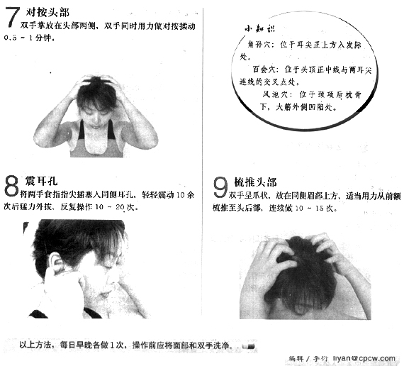 头部的自我保健按摩,具有健脑宁神、开窍镇痛、聪耳明目的功效,对头晕、耳鸣、神经衰弱、失眠、头痛等症有较好的保健治疗作用。