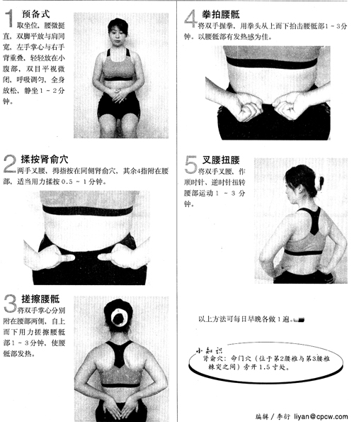 将双手叉腰,作顺时针、逆时针扭转腰部运动1~3分钟。