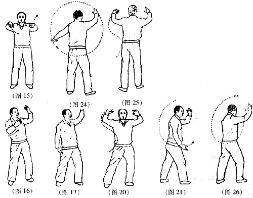 作用:此势动作广泛涉及全身各部位的穴位,双手不停地运行转动,使肩井、肩髁和颈部充分运动,直接刺激人迎、天突、缺盆、风池、风府、大椎诸穴,对防治神经衰弱、头晕头痛、中风与脑血栓等病症效果较好。而双手画S形动作对于双胁、乳根等触动较大,可防治肋膜炎、心肌炎、乳腺炎的发生。抽臂翻掌动作,强烈牵动后脑枕骨,可使大脑清醒,开窍增智。