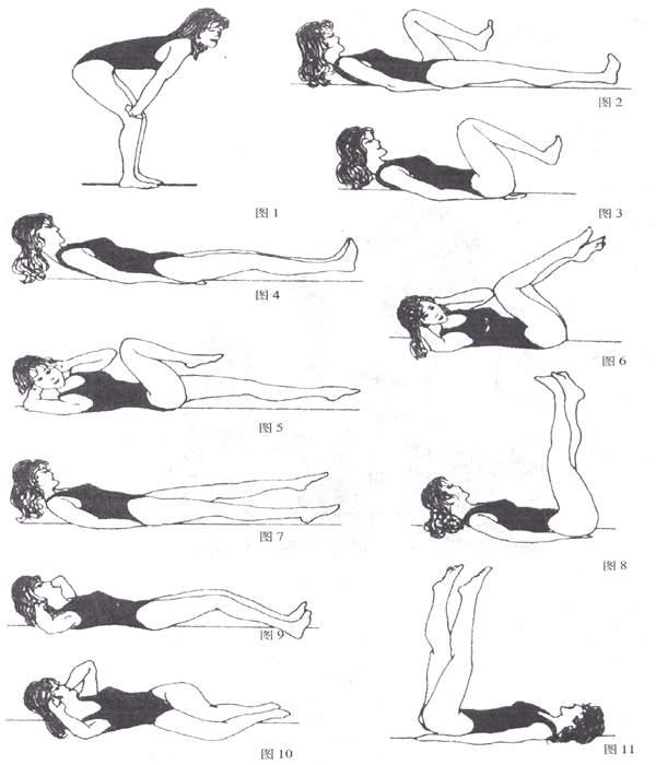 (2)双腿并拢,屈膝,双腿离地,稍停,然后双腿在不接触地面情况下,用力向下挺伸,尽量伸直。重复12次为1组,做3—5组。第4节:躯干扭转运动(图5—6) (1)仰卧,双手抱头,左腿伸直,稍离地面,右腿屈膝,向上提起,左肘触右膝,头转向右侧。 (2)收缩腹肌,左腿屈膝,向上提起,与右腿并拢。然后右腿伸直,左腿仍保持屈膝姿势,扭转身体,向相反方向重复以上动作。重复12次为1组,做2~3组。第5节:交替踢腿运动(图7-8) (1)仰卧,双手置臀下,双腿向上抬起,脚掌指向屋顶,膝微屈,小腿交错。 (2)收紧腹肌,缓慢放下两腿,保持背部平直。然后轻轻地交替上下踢腿,头和肩膀抬离地面,眼视腹部。上述动作进行5分钟为1组,做1—2组。第6节:下颏抬起运动(图9) (1)仰卧,双手抱头,背部紧贴地面。膝稍屈,脚跟着地。 (2)收紧腹肌,尽量将下颏抵住胸部,然后抬起,再抵住胸部,再抬起。重复20次为1组,做1—2组。第7节:下颏侧抬运动(图10) (1)仰卧,双手抱头,头、肩略微抬起,双腿并拢屈膝,扭向右侧。 (2)面朝屋顶,下颏抵住胸部,收紧腹肌,然后抬起,再抵住胸部,再抬起。身体扭向左侧,重复以上动作。双侧各做20次为1组,做1—2组。第8节:双腿下颏运动(图11) (1)仰卧,两腿并拢抬起,双脚指向屋顶,头部稍离地面。 (2)举腿的同时抬下颏,收紧腹肌,下颏抵住胸部。头部还原,然后再抬起,再抵住胸部。动作进行时宜屏住呼吸。重复20次为1组,做1—2组。