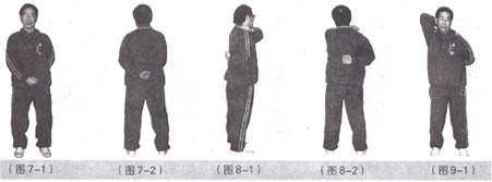 2.左拳掌侧叩右侧肩井穴,右拳背侧叩后背的一斗米穴,同时上半身略向右转。(如图8-1、8-2)