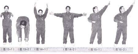 1.两腿站立略弯,右手成剑指向右上方弹射,目视剑指,左手呈拉弓势后拉,右手同时进行射拉运动,反复26次。(图15-1)