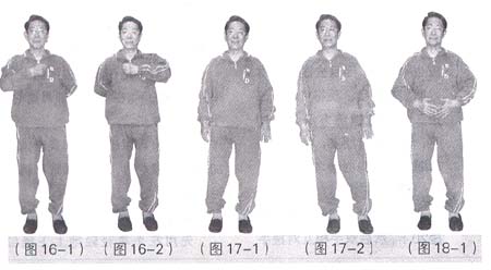 2.呼气,随呼气两手交叉,气归下丹田,然后再意守丹田一分钟即可。(图18-1)