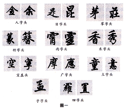 先说字头。字头有人字头、日字头、草字头、竹字头、雨字头、禾字头、宝盖头、广字头、立字头、子字头、四字头等等(见图一)。这些字头(除广字头外)与字的下面部分,两者的重心必须要在一直线上。字头的基本结构是对称性的,而做到对称或基本对称,其重心便在中间了。这样,上下部的重心在一直线上而无偏离,整个字各部分重心合轴(在中间位置),字就显得稳且正,无倾侧之虞。广字头,因为是非对称型的,所以,要使整个字重心平稳,就必须使其内部这一部分的重心和广字头部分的重心的加合重心在整个字的中间。由于其内部这一部分在字的偏右侧,其重心在整个字中略偏右,而广字头恰因不对称性,其重心便略略偏左,两者相互取得弥补,最终得到稳妥的结合,写广字头这类字,要求内部匀整,外部(即广字头)劲挺。