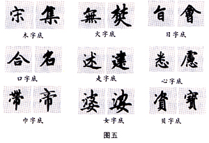 次说字底。字底有木字底、火字底、日字底、心字底、口字底、走之底、女字底、贝字底、巾字底等等(见图五)。