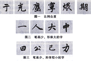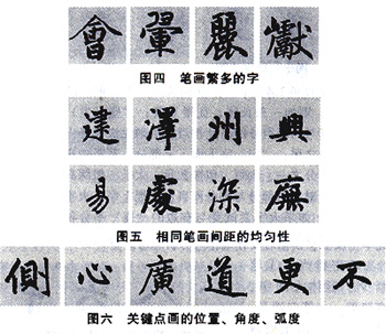 疏密得当。①笔画少、形体大的字,宜疏朗,主笔应遒劲、舒放,但须防止松散(见图二)。②笔画少、形体较小的字,笔画宜粗壮。结构虽小,但要写得丰满,以能小中见大(见图三)。③笔画繁多的字,结构要求紧密、调匀,大部分笔画宜写得细瘦一些,以利于笔画间的分辨与透气。这类字的大小仍应控制在规定范围,不能因为笔画繁多,就可以超出规定范围“写所欲写”(见图四)。所以,要求疏密得当,实际是一个“分间布白”的问题,汉字楷书的美学精髓也就是其黑白的分布恰到最佳处。笔画的比例是否合度,是会影响到疏密得当的。另外,还必须要十分注意横画之间、竖画之间、撇之间及点之间距离的均匀性(见图五)。