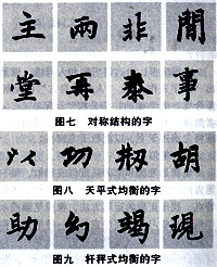 汉字的结构,有些是对称的,但大多并不对称。对称结构的字,只要写得挺健、整齐,较好地把它的对称性体现出来,就可能使字达到“重心平稳”(见图七)。但要避免将对称性表现得过死,如镜象一般。更多的不对称结构的字,则要力求使其左右均衡,即做到有变化的平衡,来达到整个字“重心平稳”的目的。这种均衡有两种不同形式:①天平式均衡。字的左右两边笔画、形态不同,但笔画数量较接近,即视觉重量相等。它的平衡点在中轴上,即两边各自的重心到支点(平衡点)所在的中轴的距离(力臂)基本相同,如图八所示的例字。这类字,写的时候切忌左右平头齐脚,要有适度的错落变化。②杆秤式均衡。字的左右两边笔画数量明显不一,即视觉重量不等,它的平衡点在整个字的中心线上,但两边各自的重心到支点(平衡点)所在的中心线距离(力臂)则不等。视觉重量轻的部分力臂长些,重的部分力臂短些,而各自重量与其力臂的乘积(即力矩)却是相等的,这样,整个字仍会取得十分均衡的效果,如图九所示的例字。这类字要注意布置好笔画的疏密和位置。